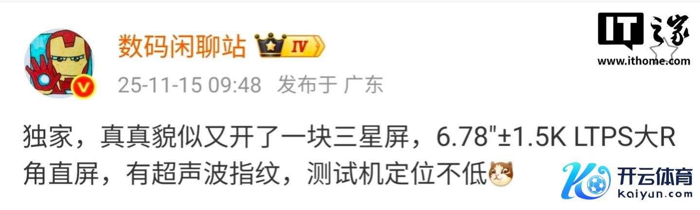 IT之家 11 月 15 日音信,据博主 @数码闲扯站 当天爆料,realme 真我貌似又开了一块屏,6.78\"±1.5K LTPS 大 R 角直屏,有指纹云开体育,测试机定位不低。