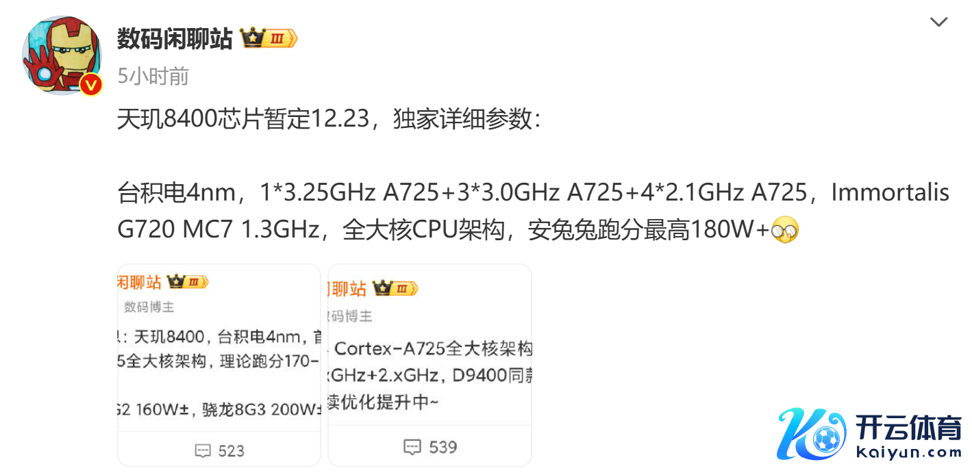 日前开云体育,据著名数码博主数码漫谈站爆料,联发科旗下的全新天玑8400芯片暂定于12月23日弘扬发布。