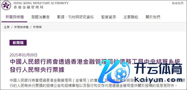 据微信公众号“中国东谈主民银行”1月9日音尘,为丰富香港高信用品级东谈主民币金融产物,完善香港东谈主民币收益率弧线,凭证中国东谈主民银行与香港金融处分局签署的《对于使用债务器用中央结算系统刊行中国东谈主民银行单据的调和备忘录》,2025年1月15日,中国东谈主民银即将通过香港金融处分局债务器用中央结算系统(CMU)债券投标平台,招标刊行2025年第一期中央银行单据。