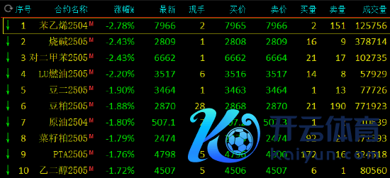 早盘开盘,国内期货主力合约大皆下落,苯乙烯(EB)、烧碱、低硫燃料油(LU)跌超2%,豆二、豆粕、SC原油、纯碱跌近2%;涨幅方面,集运欧线涨近6%,外洋铜、沪铜、沪银涨超1%。